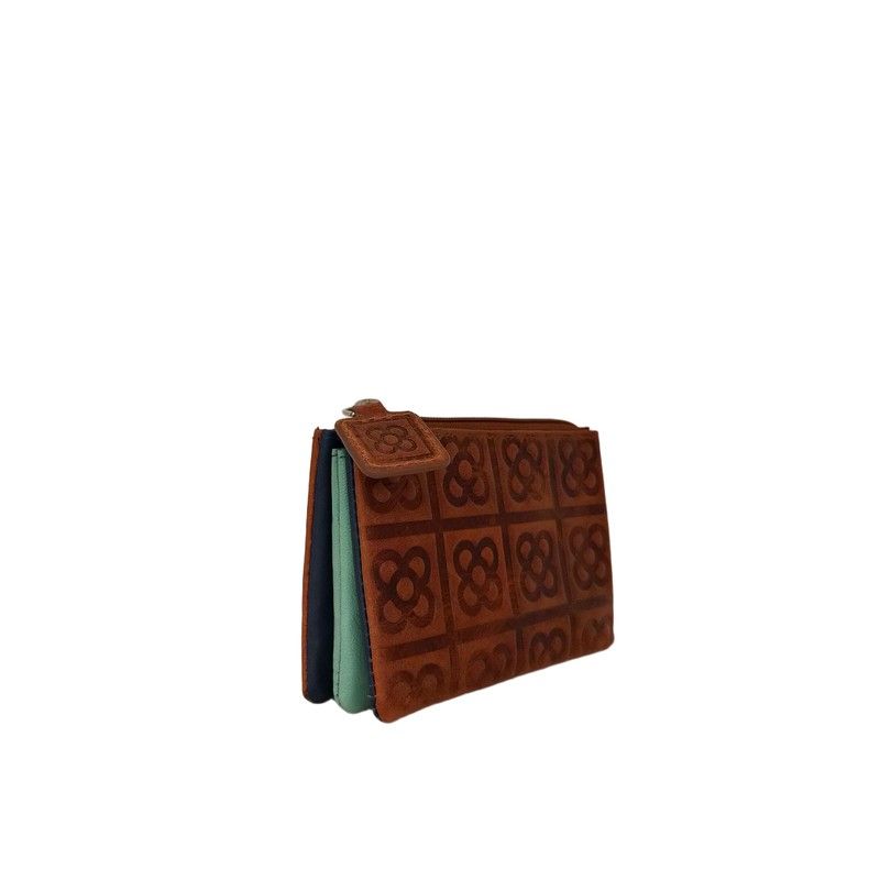 Monedero de piel con el grabado de la típica baldosa de Barcelona "Panot". Apto para tarjetas, con tres departamentos, con anilla para llaves y protección RFID. Al ser realizadas de manera artesanal el color puede variar ligeramente.